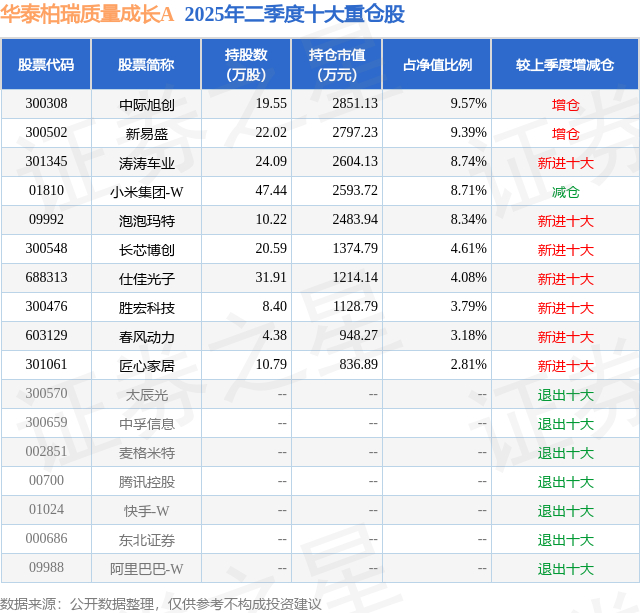 华泰柏瑞质量成长A的前十大重仓股如下: