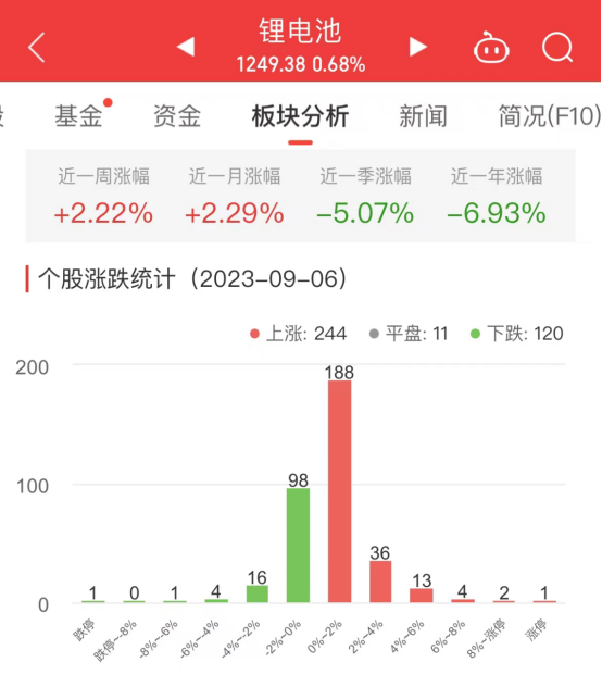 中国经济网北京9月6日讯今日,锂电池板块整体涨幅0.68%,其中244只股票上涨,11只股票平盘,120只股票下跌。