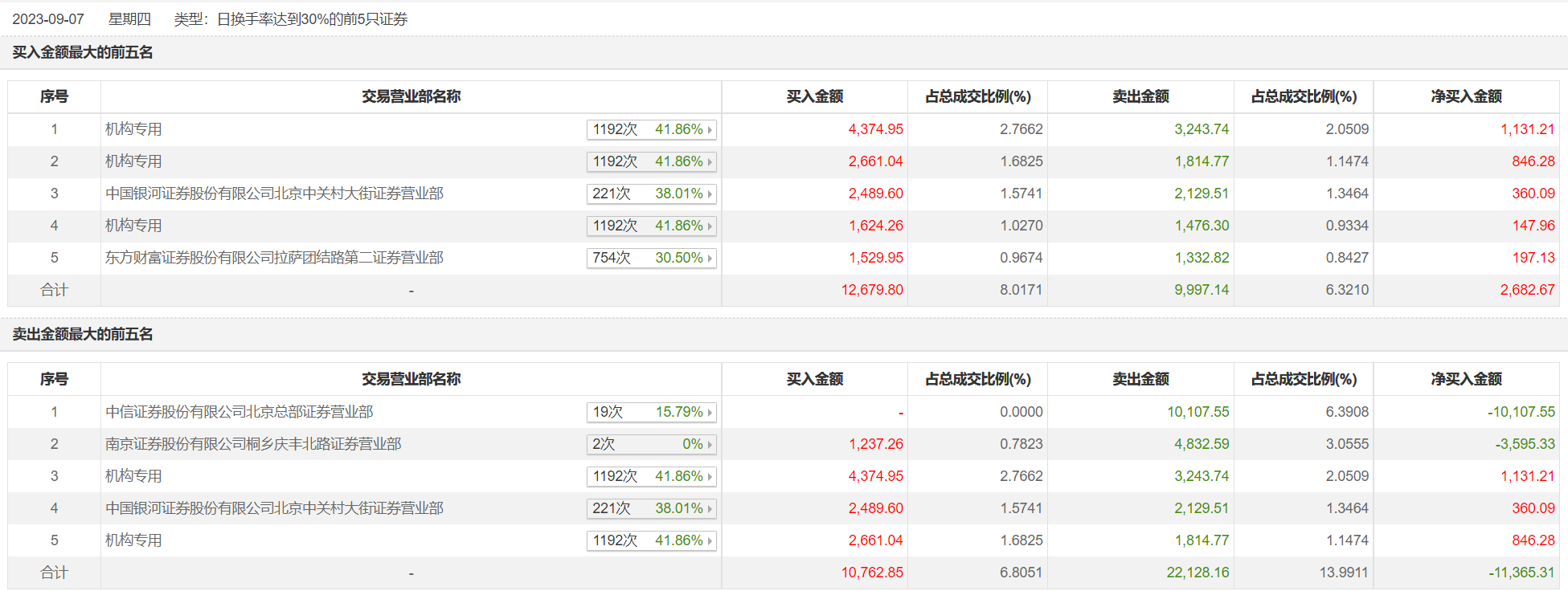 具体来看,机构买入8660.26万元,卖出6534.81万元,合计净买入2125.45万元。此外,中信证券北京总部证券营业部、南京证券桐乡庆丰北路证券营业部分别卖出1.01亿元、4832.59万元;中国银河证券北京中关村大街证券营业部、东方财富证券拉萨团结路第二证券营业部分别买入2489.60万元、1529.95万元。