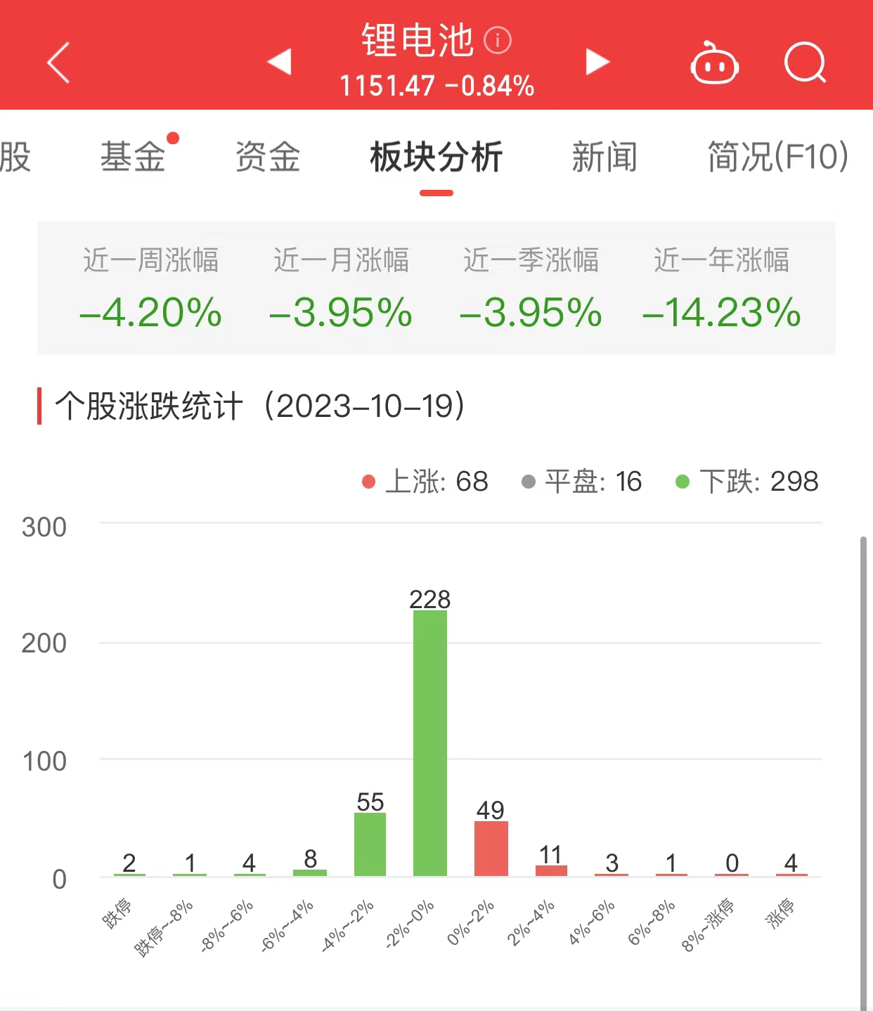 中国经济网北京10月19日讯今日,锂电池板块整体跌幅0.84%,其中68只股票上涨,16只股票平盘,298只股票下跌。
