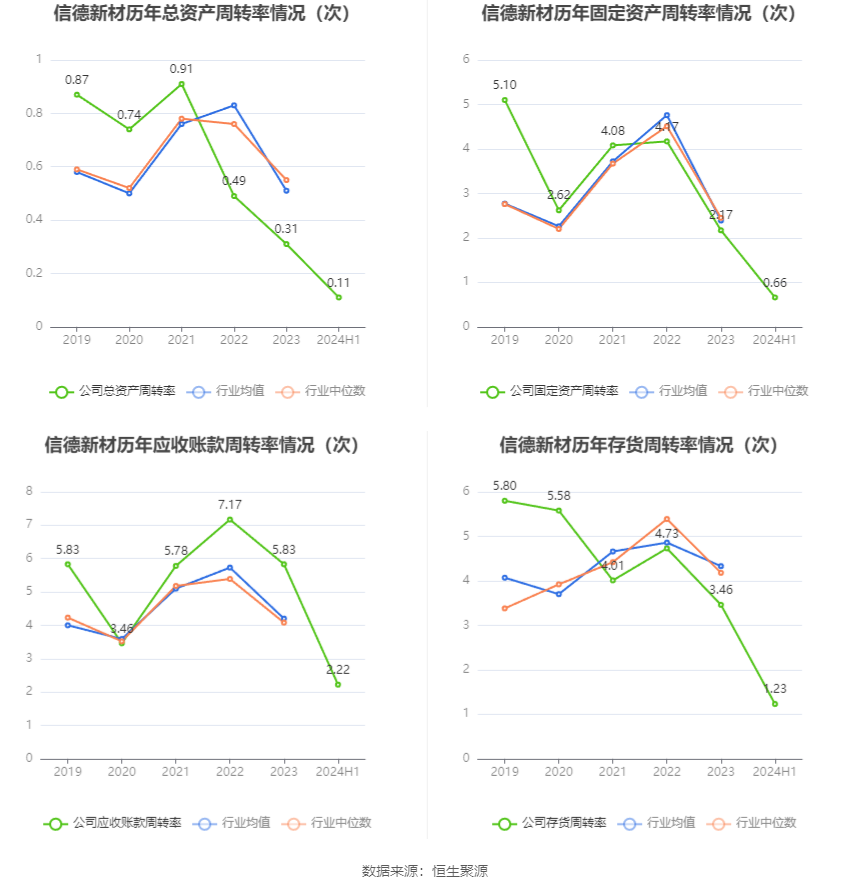 营运能力方面,2024年上半年,公司公司总资产周转率为0.11次,上年同期为0.12次(2023年上半年行业平均值为0.26次,公司位居同行业41/45);固定资产周转率为0.66次,上年同期为1.12次(2023年上半年行业平均值为1.34次,公司位居同行业28/45);公司应收账款周转率、存货周转率分别为2.22次、1.23次。