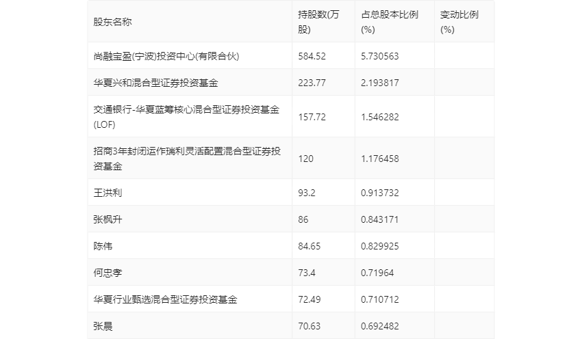 半年报显示,2024年上半年末的公司十大流通股东中,新进股东为招商3年封闭运作瑞利灵活配置混合型证券投资基金、华夏行业甄选混合型证券投资基金,取代了一季度末的国寿安保成长优选股票型证券投资基金、银华核心价值优选混合型证券投资基金。在具体持股比例上,华夏兴和混合型证券投资基金、华夏蓝筹核心混合型证券投资基金(LOF)、王洪利、何忠孝持股有所上升,张枫升、陈伟、张晨持股有所下降。
