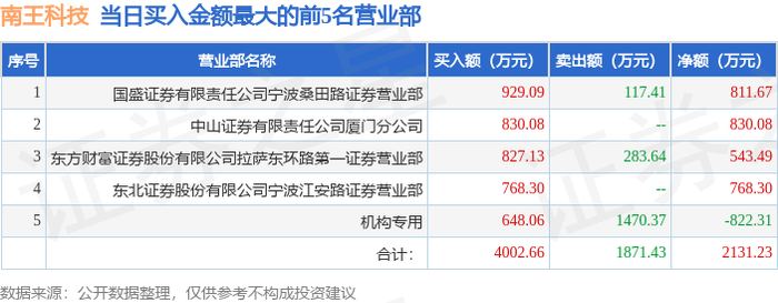 12月29日南王科技(301355)龙虎榜数据:游资宁波桑田路上榜