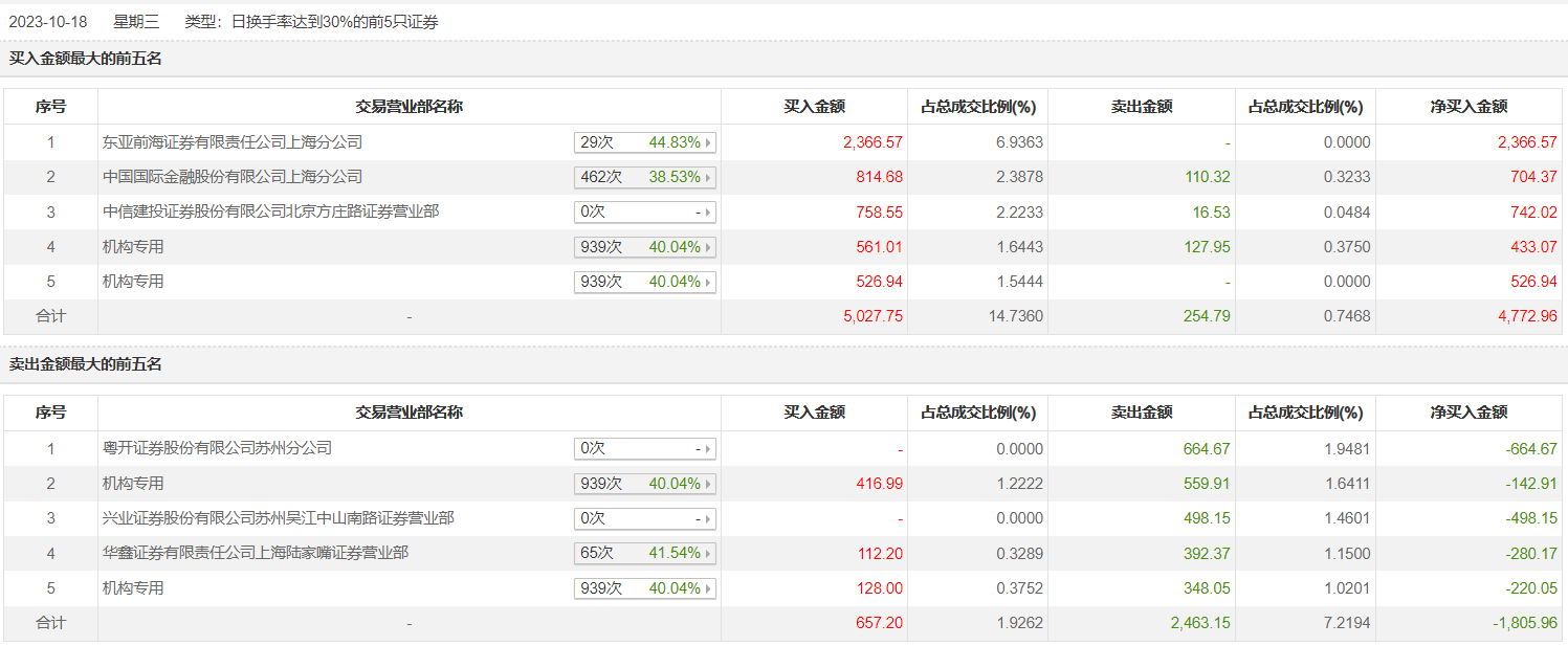 北方长龙10月18日涨6.21%,全天换手率达37.27%,振幅达11.21%。龙虎榜数据显示,营业部席位合计净买入2967.0万元。其中,机构买入1632.95万元,卖出1035.91万元,合计净买入597.04万元。此外,东亚前海证券上海分公司、中国国际金融上海分公司分别买入2366.57万元、814.68万元;粤开证券苏州分公司、兴业证券苏州吴江中山南路证券营业部分别卖出664.67万元、498.15万元。