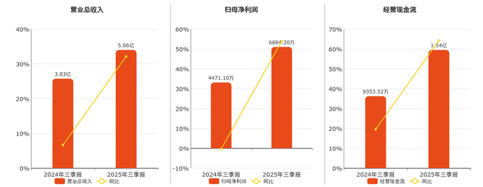 公司营业总收入为5.06亿元。归母净利润为6884.20万元。经营活动现金净流入为1.54亿元。