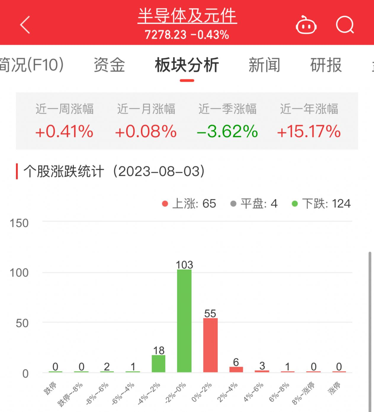 中国经济网北京8月3日讯 今日,半导体及元件板块整体跌幅0.43%,其中65只股票上涨,4只股票平盘,124只股票下跌。