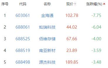金海通、灿瑞科技、佰维存储、南亚新材、源杰科技位列涨幅榜后五位,涨幅分别为-7.75%、-6.04%、-4.00%、-3.59%、-3.48%。