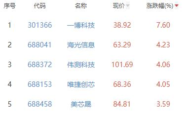 其中,一博科技、海光信息、伟测科技、唯捷创芯、美芯晟位列板块涨幅前五位,涨幅分别为7.60%、4.23%、4.06%、4.05%、3.59%。