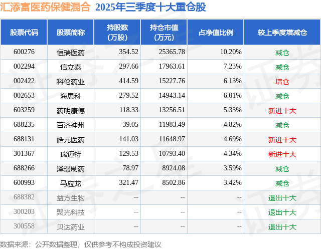 汇添富医药保健混合的前十大重仓股如下: