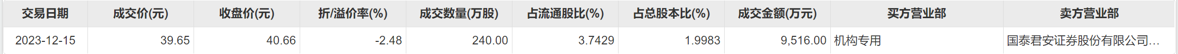 今日大宗交易成交240万股,成交额9516万元,占当日总成交额的28.37%,成交价39.65元,较市场收盘价折价2.48%。
