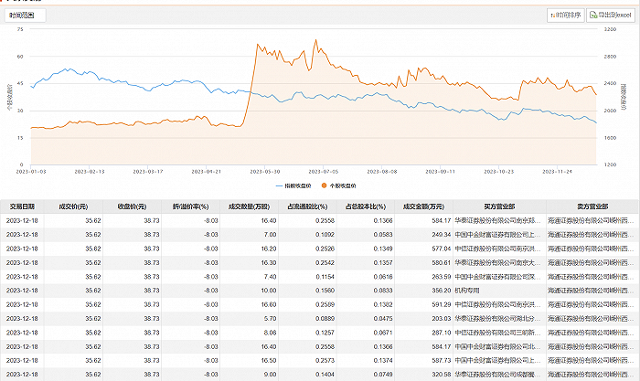 今日大宗交易成交145.56万股,成交额5184.85万元,占当日总成交额的23.54%,成交价35.62元,较市场收盘价折价8.03%。