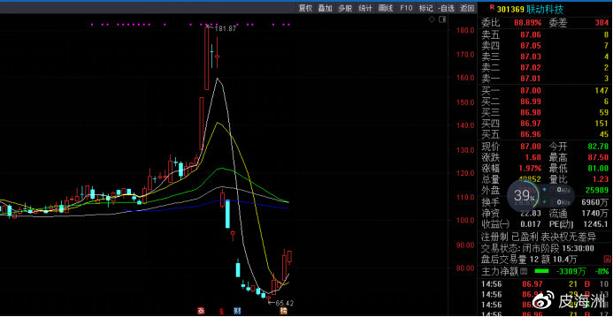 但经过股权登记实施了分红及转增股本之后,联动科技的股价明显出现了下跌的走势,也即贴权贴息。4月19日该公司股权登记日的收盘价为169.28元,也即相当于除权除息后的110.69元。然而,从4月20日开始,该公司股价明显下跌,到5月5日的收盘价跌至67.41元,较4月19日收盘价的除权除息价格110.69元下跌了39.10%,即下跌了近40%,同时投资者参与分红,每10股派送32.5元,假如按10%征收红利税,这意味着投资者每10股要上缴3.25元的红利税。