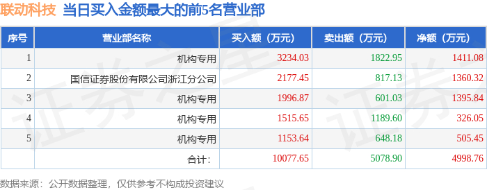 证券之星消息,沪深交易所2025年9月26日公布的交易公开信息显示,联动科技(301369)因日涨幅达到15%的前5只证券登上龙虎榜。此次是近5个交易日内第1次上榜。