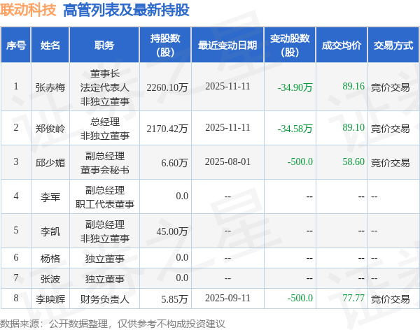 联动科技的高管列表及最新持股情况如下: