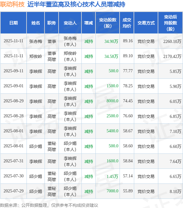 联动科技近半年内的董监高及核心技术人员增减持详情如下: