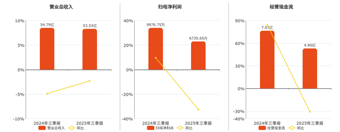公司营业总收入为53.53亿元,在已披露的同业公司中排名第3,较去年同报告期营业总收入减少1.26亿元,同比较去年同期下降2.30%。归母净利润为6735.65万元,在已披露的同业公司中排名第40,较去年同报告期归母净利润减少3241.10万元,同比较去年同期下降32.49%。经营活动现金净流入为4.90亿元,在已披露的同业公司中排名第10,较去年同报告期经营活动现金净流入减少2.17亿元,同比较去年同期下降30.65%。