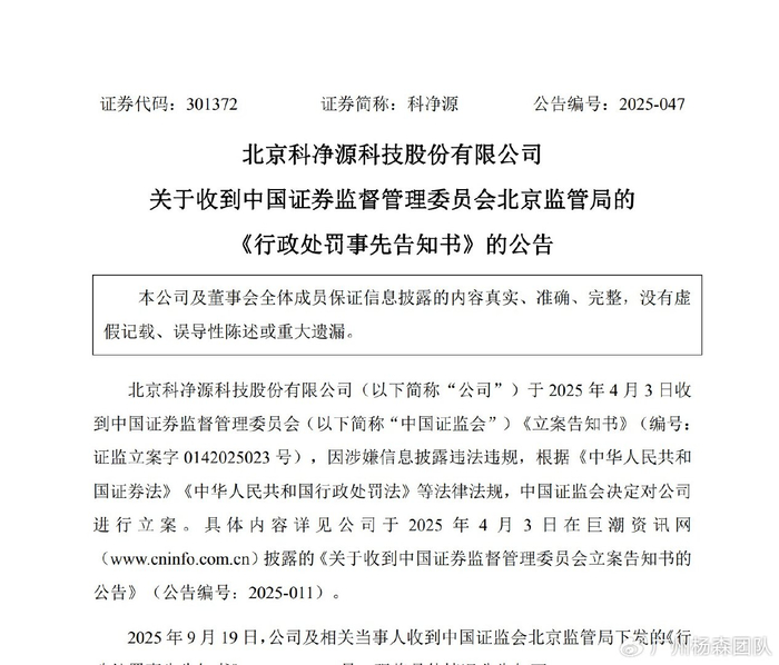 2025年9月20日,北京科净源科技股份有限公司(科净源或公司)披露,中国证监会北京监管局下发的《行政处罚事先告知书》。