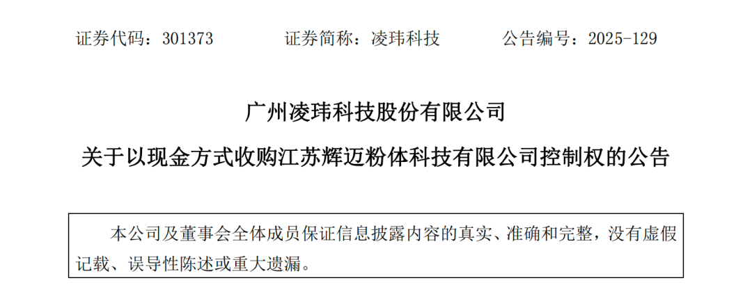 慧正资讯,2025年12月23日,广州凌玮科技股份有限公司(证券代码:301373,简称“凌玮科技”)发布公告,宣布拟以现金方式分阶段收购江苏辉迈粉体科技有限公司(简称“江苏辉迈”)100%股权,以此获取标的公司控制权,这也是凌玮科技切入高端电子材料新赛道、构建长期竞争优势的关键战略布局。