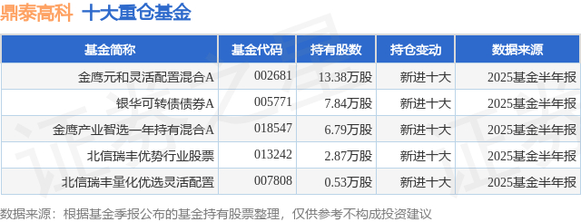 根据2025基金半年报公募基金重仓股数据,重仓该股的公募基金共5家,其中持有数量最多的公募基金为金鹰基金的金鹰元和灵活配置混合A。金鹰元和灵活配置混合A目前规模为0.51亿元,最新净值1.3484(9月25日),较上一交易日下跌0.95%,近一年上涨46.04%。该公募基金现任基金经理为倪超。倪超在任的基金产品包括:金鹰行业优势混合A,管理时间为2015年6月11日至今,期间收益率为53.67%;金鹰鑫瑞混合A,管理时间为2020年9月25日至今,期间收益率为30.52%;金鹰年年邮享一年持有债券A,管理时间为2021年11月25日至今,期间收益率为9.4%。