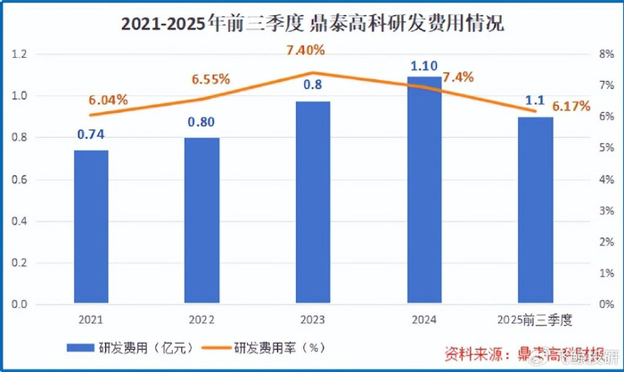 面对技术难题,鼎泰高科常年保持高研发投入,2021-2025年前三季度研发费用占比持续高于6%,领先尖点科技(4%左右)等主要竞争对手。