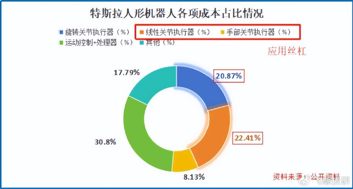 以特斯拉人形机器人为例,其应用丝杠的组件错落分布在机器人的四肢内,是其运动控制的核心,成本占总成本的40%以上,重要性可想而知。