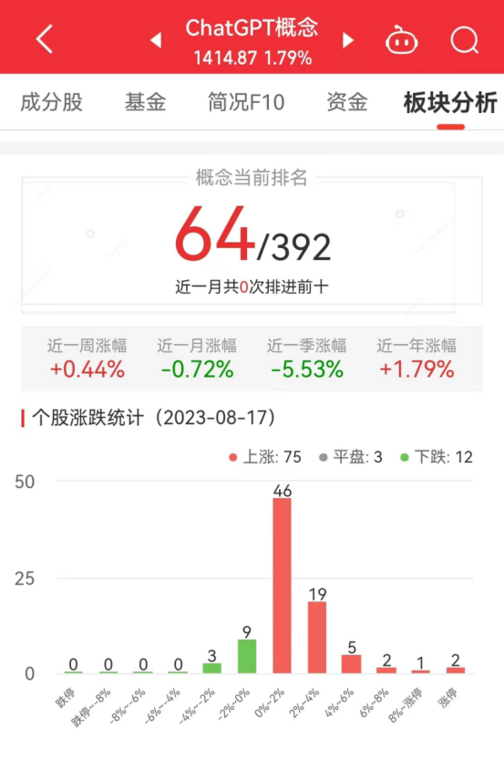 中国经济网北京8月17日讯今日,ChatGPT概念板块整体涨幅1.79%,其中,75只股票上涨,3只股票平盘,12只股票下跌。