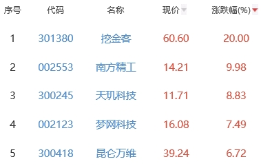 其中,挖金客、南方精工、天玑科技、梦网科技、昆仑万维位列板块涨幅前五位,涨幅分别为20.00%、9.98%、8.83%、7.49%、6.72%。