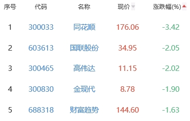 同花顺、国联股份、高伟达、金现代、财富趋势位列涨幅榜后五位,涨幅分别为-3.42%、-2.05%、-2.02%、-1.90%、-1.63%。
