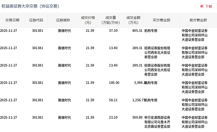 11月27日,赛维时代大宗交易成交330.51万股,成交额7135.72万元,占当日总成交额的51.36%,成交价21.59元,较市场收盘价23.6元折价8.52%。