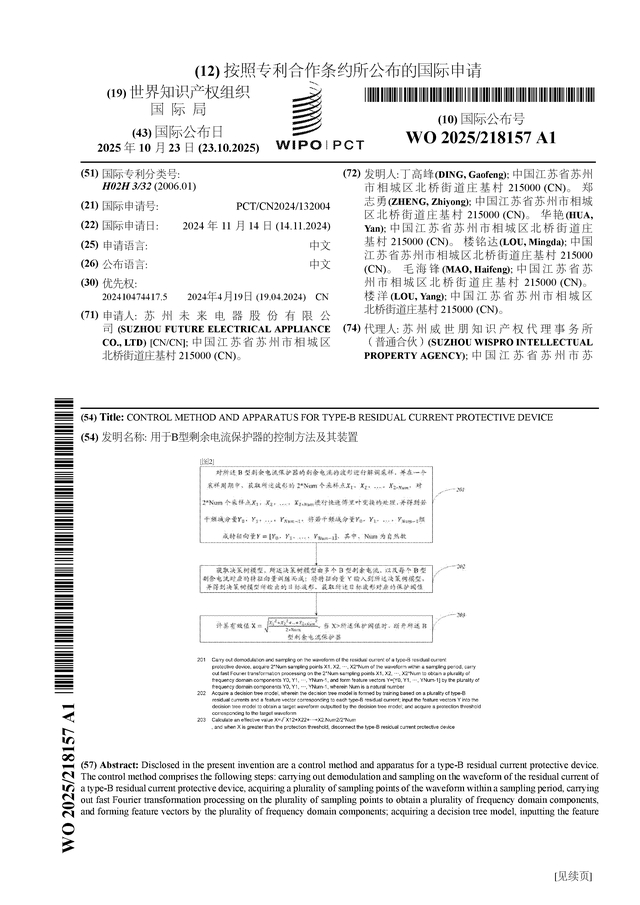 未来电器公布国际专利申请:“用于B型剩余电流保护器的控制方法及其装置”