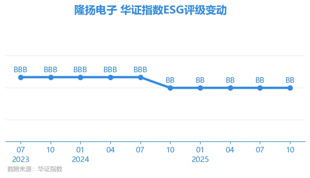 日前,华证指数公布了新一期(2025年10月31日)的ESG评级结果,隆扬电子(301389.SZ)获得BB评级(华证指数评级为C起至AAA九档,C为最低档,AAA为其最高一级评级/AA为其第二档),上一期(2025年7月31日)ESG评级为BB。本期ESG评级在531家电子设备、仪器和元件行业A股上市公司中排名第234(上一期排名第223)。