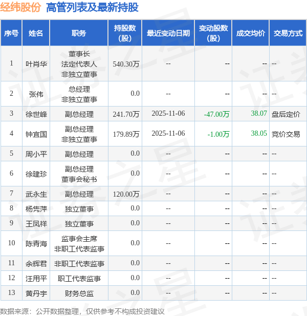 经纬股份近半年内的董监高及核心技术人员增减持详情如下: