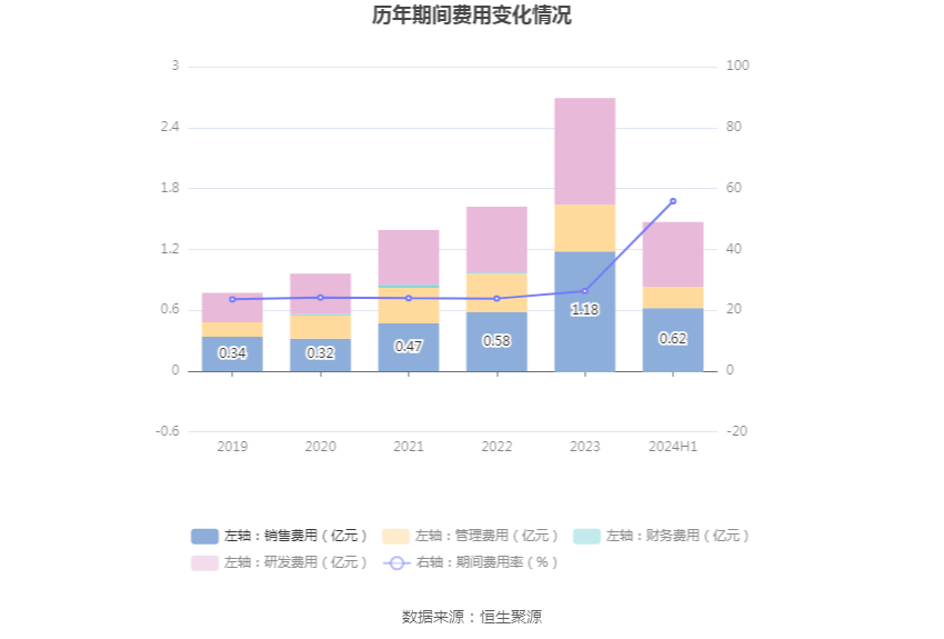 2024年上半年,公司期间费用为1.46亿元,较上年同期增加4145.17万元;期间费用率为55.82%,较上年同期上升26.21个百分点。其中,销售费用同比增长30.66%,管理费用同比下降5.62%,研发费用同比增长62.51%,财务费用由去年同期的-475.30万元变为-117.99万元。