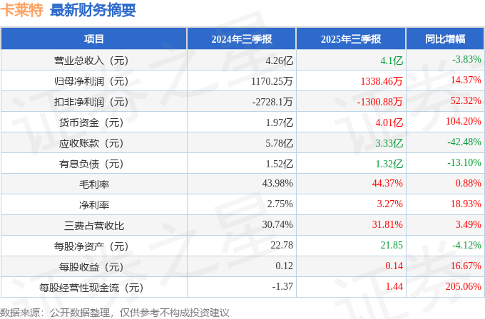 卡莱特(301391)2025年三季报简析:净利润同比增长14.37%,盈利能力上升
