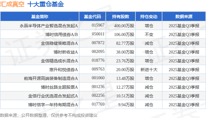 持有汇成真空最多的基金为永赢半导体产业智选混合发起A,目前规模为8.58亿元,最新净值1.7048(10月30日),较上一交易日下跌1.73%,近一年上涨78.12%。该基金现任基金经理为张海啸。