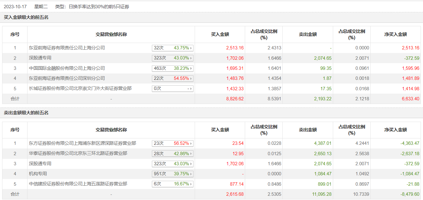 昊帆生物10月17日涨7.29%,全天换手率达44.58%,振幅达13.97%。龙虎榜数据显示,营业部席位合计净卖出1473.61万元。其中,机构合计净卖出1084.47万元。此外,东亚前海证券上海分公司、深股通专用分别买入2513.16万元、1702.06万元;东方证券上海浦东新区源深路证券营业部、华泰证券北京东三环北路证券营业部分别卖出4387.01万元、2650.13万元。