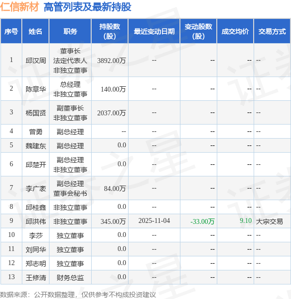 仁信新材近半年内的董监高及核心技术人员增减持详情如下: