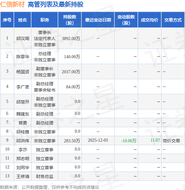 证券之星消息,根据12月8日市场公开信息、上市公司公告及交易所披露数据整理,仁信新材(301395)最新董监高及相关人员股份变动情况:2025年12月5日公司董事邱洪伟共减持公司股份10.0万股,占公司总股本为0.0412%。变动期间公司股价上涨2.2%,12月5日当日收盘报11.15元。
