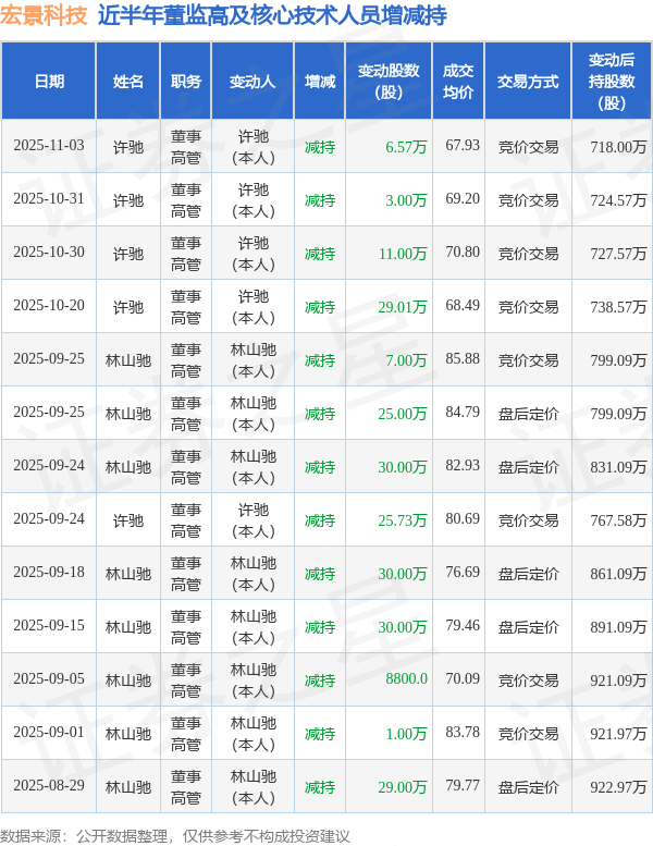 宏景科技近半年内的董监高及核心技术人员增减持详情如下: