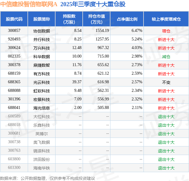 中信建投智信物联网A的前十大重仓股如下: