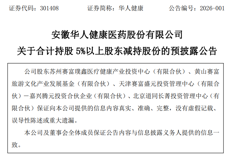 1月14日,华人健康(301408.SZ)发布公告,赛富投资合计持有公司股份2010.52万股(占公司总股本的比例为5.03%),计划自本公告披露之日起十五个交易日后的三个月内,以集中竞价交易、大宗交易方式减持的股份数量不超过800万股(占公司总股本的比例为2%)。