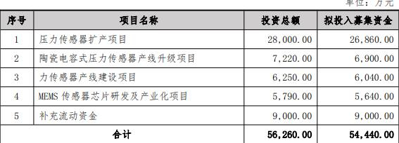 本次发行募集资金总额不超过54,440.00万元(含本数),在扣除相关发行费用后的募集资金净额将全部用于压力传感器扩产项目、陶瓷电容式压力传感器产线升级项目、力传感器产线建设项目、MEMS传感器芯片研发及产业化项目、补充流动资金。