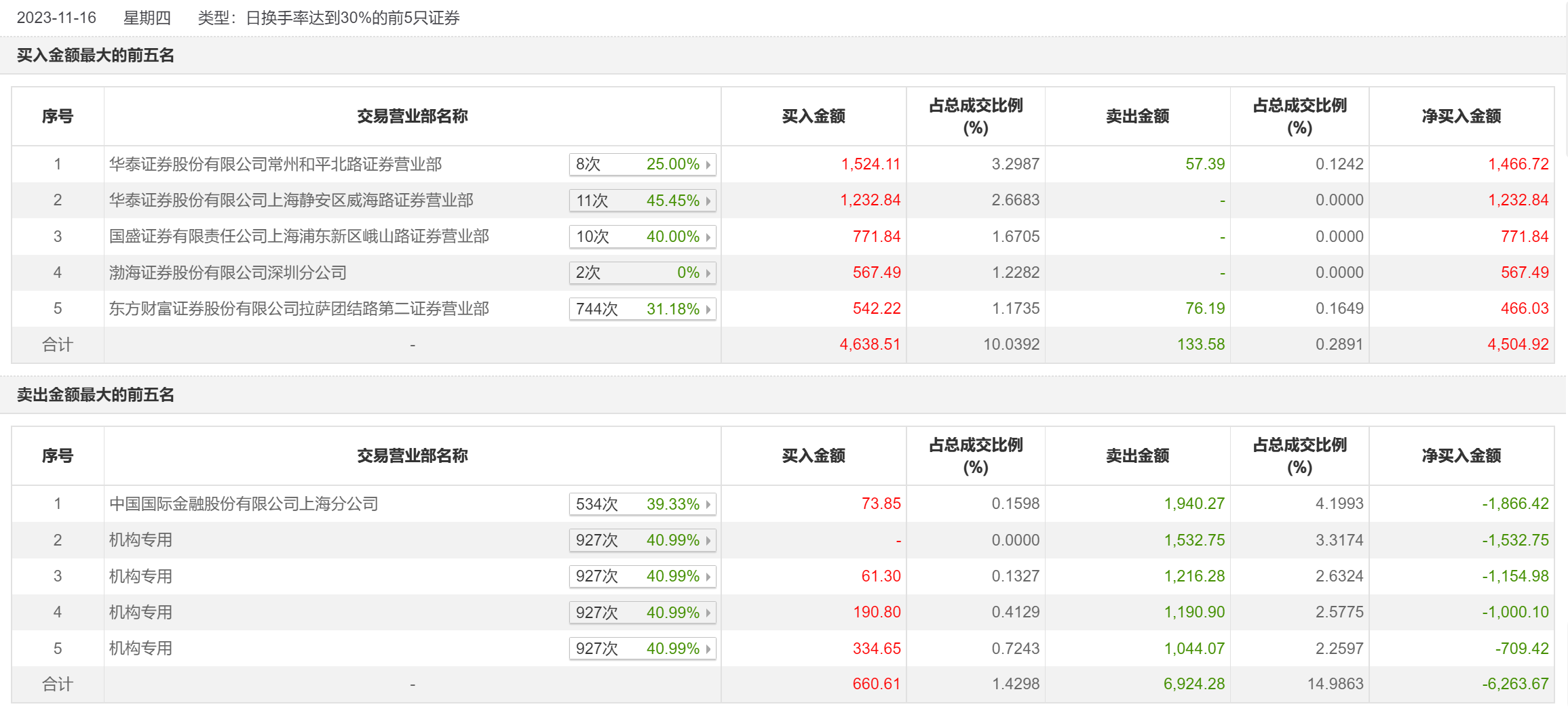 具体来看,机构买入586.76万元,卖出4984.01万元,合计净卖出4397.25万元。此外,华泰证券常州和平北路证券营业部、华泰证券上海静安区威海路证券营业部分别买入1524.11万元、1232.84万元;中国国际金融上海分公司、东方财富证券拉萨团结路第二证券营业部分别卖出1940.27万元、76.19万元。
