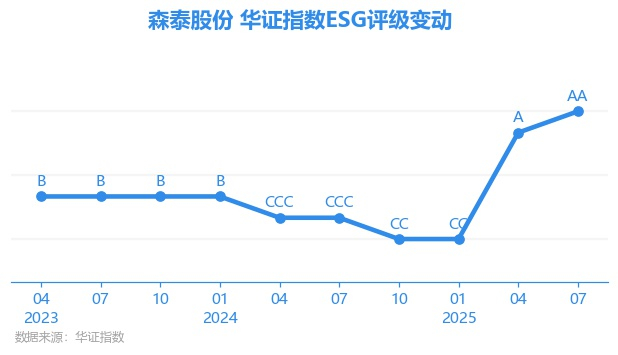 日前,华证指数公布了新一期(2025年7月31日)的ESG评级结果,森泰股份(301429.SZ)获得AA评级(华证指数评级为C起至AAA九档,C为最低档,AAA为其最高一级评级/AA为其第二档),上一期(2025年4月30日)ESG评级为A。本期ESG评级在462家化学制品行业A股上市公司中排名第23(上一期排名第51)。