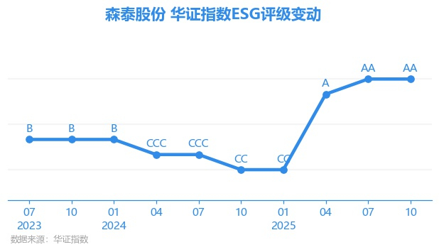 日前,华证指数公布了新一期(2025年10月31日)的ESG评级结果,森泰股份(301429.SZ)获得AA评级(华证指数评级为C起至AAA九档,C为最低档,AAA为其最高一级评级/AA为其第二档),上一期(2025年7月31日)ESG评级为AA。本期ESG评级在494家化学制品行业A股上市公司中排名第27(上一期排名第23)。