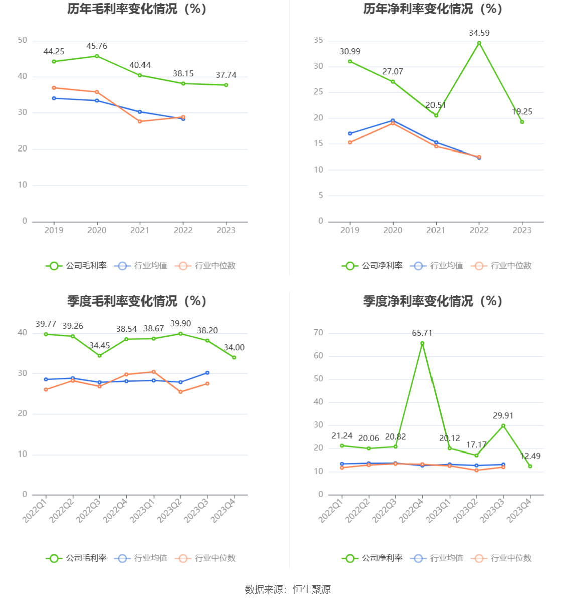 2023年,公司毛利率为37.74%,同比下降0.41个百分点;净利率为19.25%,较上年同期下降15.34个百分点。从单季度指标来看,2023年第四季度公司毛利率为34.00%,同比下降4.54个百分点,环比下降4.20个百分点;净利率为12.49%,较上年同期下降53.22个百分点,较上一季度下降17.42个百分点。