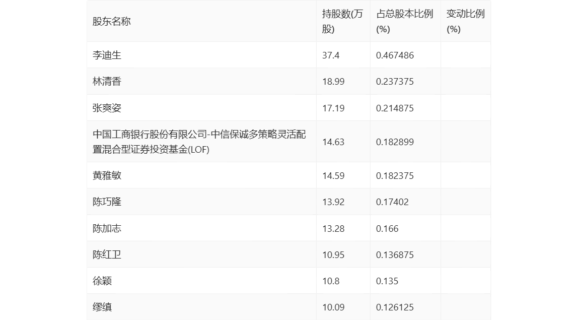 一季报显示,2024年一季度末公司十大流通股东中,新进股东为林清香、张爽姿、黄雅敏、陈巧隆、陈加志、陈红卫、徐颖、缪缜,取代了上年末的光大证券(维权)股份有限公司、UBS AG、中信证券股份有限公司、平安证券股份有限公司、招商证券股份有限公司、中国国际金融香港资产管理有限公司-CICCFT4(QFII)、华泰证券股份有限公司、BARCLAYS BANK PLC。在具体持股比例上,李迪生、中国工商银行股份有限公司-中信保诚多策略灵活配置混合型证券投资基金(LOF)持股有所下降。