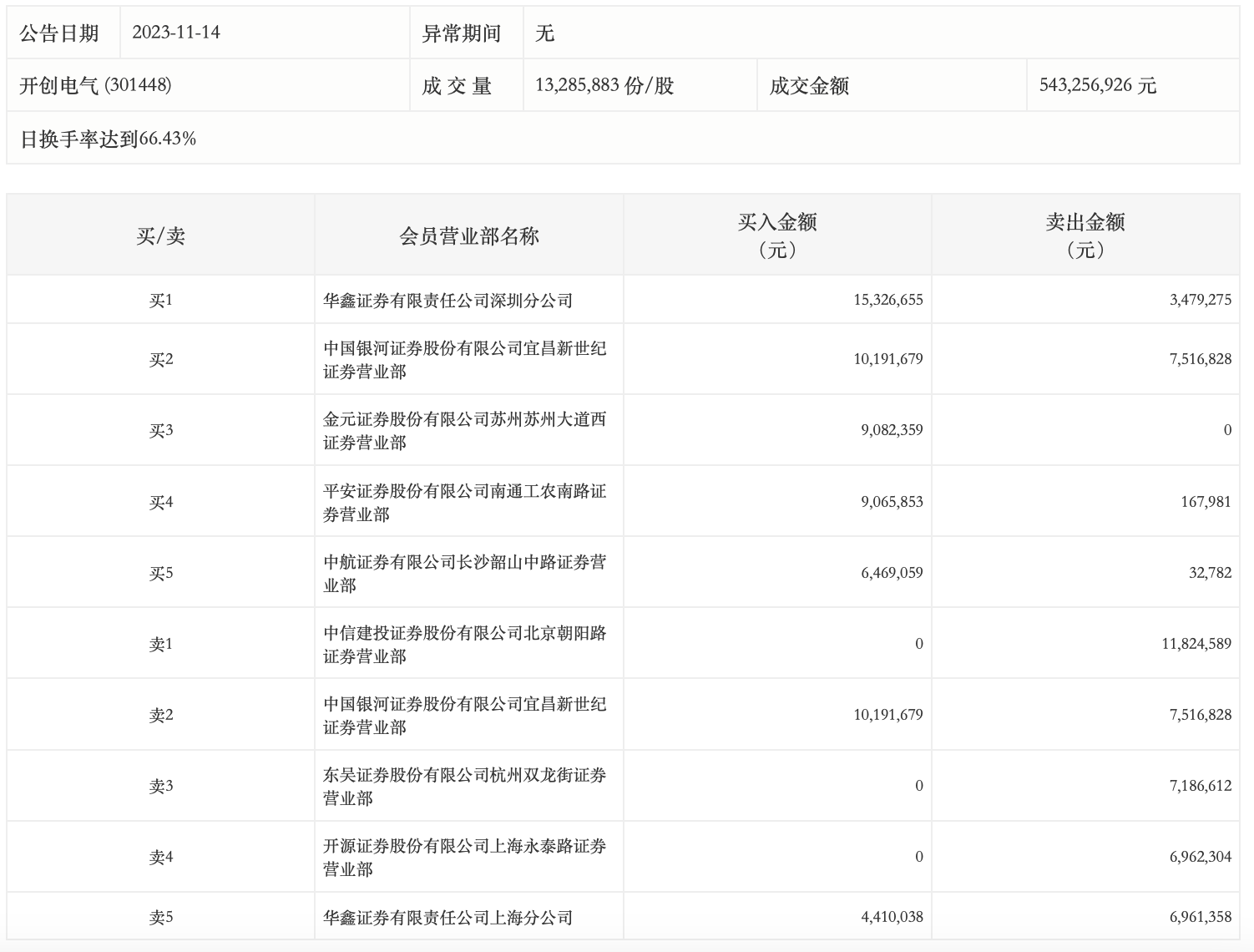 11月14日,开创电气今日涨停,全天换手率达66.43%,振幅达17.7%。龙虎榜数据显示,营业部席位合计净买入1041.39万元。其中,华鑫证券深圳分公司、中国银河证券宜昌新世纪证券营业部分别买入1532.67万元、1019.17万元;中信建投证券北京朝阳路证券营业部、中国银河证券宜昌新世纪证券营业部分别卖出1182.46万元、751.68万元。