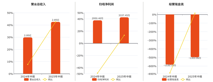 公司营业总收入为2.85亿元,在已披露的同业公司中排名第26。归母净利润为3337.45万元,在已披露的同业公司中排名第19。经营活动现金净流入为-1305.06万元。