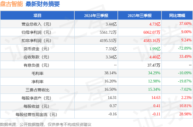 据证券之星公开数据整理,近期盘古智能(301456)发布2025年三季报。截至本报告期末,公司营业总收入4.73亿元,同比上升37.6%,归母净利润6062.07万元,同比上升9.0%。按单季度数据看,第三季度营业总收入1.88亿元,同比上升30.7%,第三季度归母净利润2724.62万元,同比上升4.34%。本报告期盘古智能应收账款上升,应收账款同比增幅达33.49%。